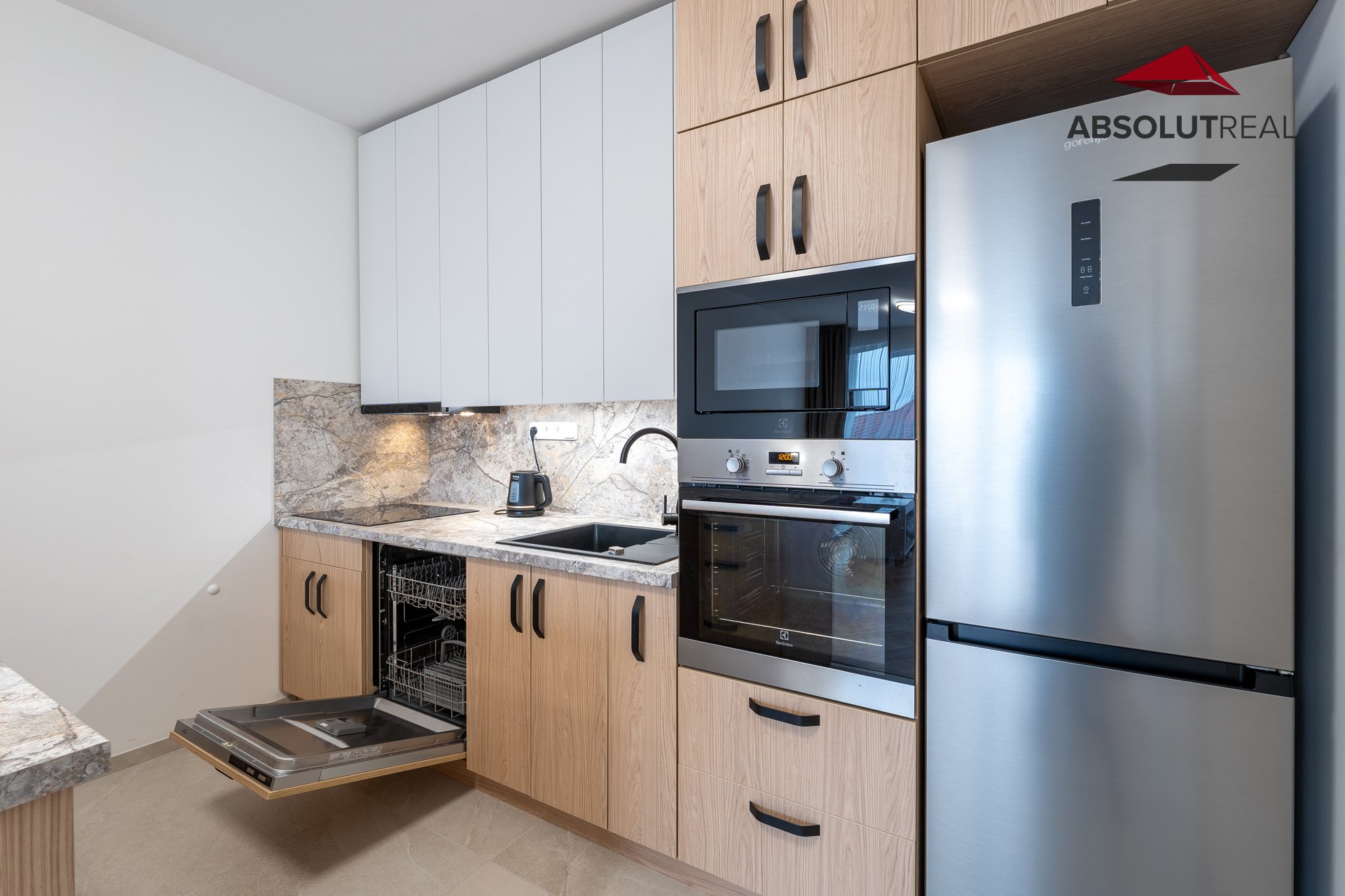 Interiér je kompletně vybaven ve vysoké kvalitě, od na míru řešené kuchyňské linky včetně veškerých spotřebičů (indukční deska, digestoř, trouba, mikrovlnná trouba a myčka), přes jídelní stůl s židlemi až po obývací část, která je zařízena sedací soupravou, konferenčním stolkem, komodou a televizí. Ložnice nabízí manželskou postel a vestavěnou šatní skříň.