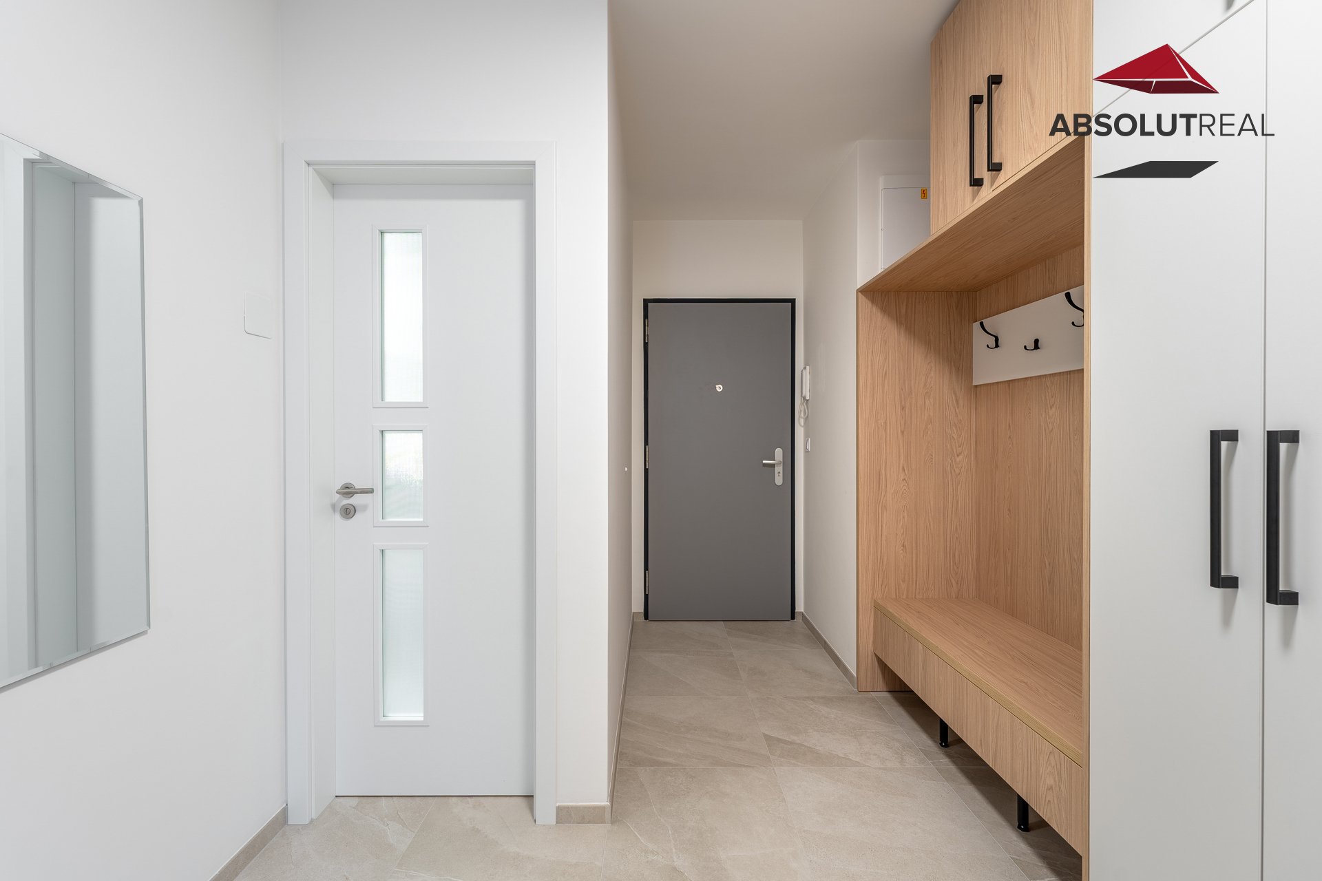 V předsíni (10,14m2) je pak postaráno o dostatek dalších úložných prostor v praktických na míru řešených skříních i s prostorem pro sedací botník.