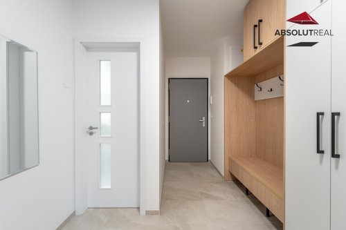 Byt je řešen s důrazem na kvalitu, design a komfort. Dominantou jsou velké prosklené dveře, které přivádějí do interiéru dostatek denního světla a propojují obytný prostor s prostornou průběžnou terasou (7,95 m2) orientovanou na východ. Ta je přístupná jak z obývacího pokoje s kuchyňským koutem (25,39m2), tak z ložnice (13,93m2) a vytváří tak příjemné soukromé venkovní zázemí s posezením.
