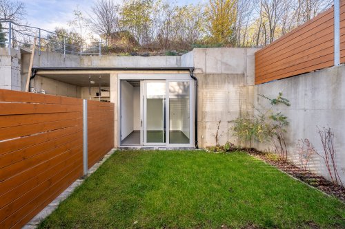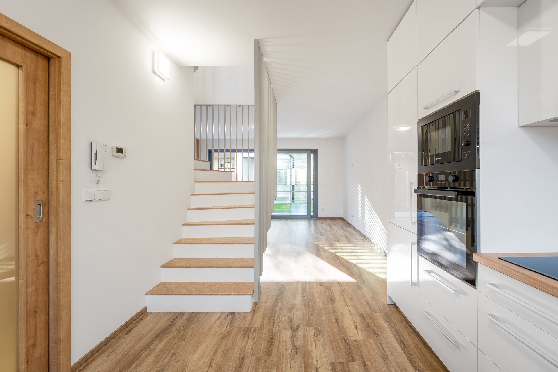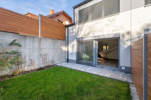 V přízemí se tedy nachází zádveří, chodba s vestavěnými skříněmi, samostatná toaleta pro spodní patro, kuchyně s moderní kuchyňskou linkou řešenou na míru propojena s obývacím pokojem, který je jednak pěkně prosvětlen velkými posuvnými hliníkovými dveřmi skrz, které lze vstoupit na dvorek a zahrádku, za kterou se nachází další obytný prostor s širokým spektrem využití dle vašich představ.